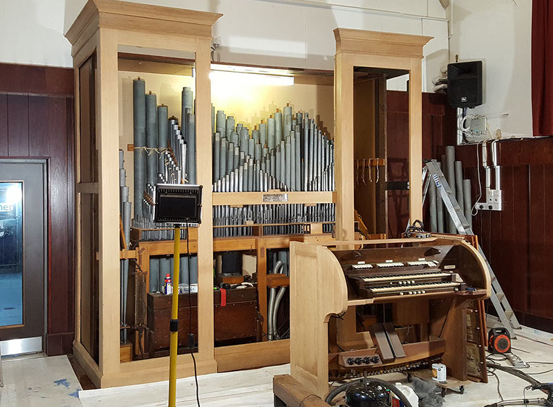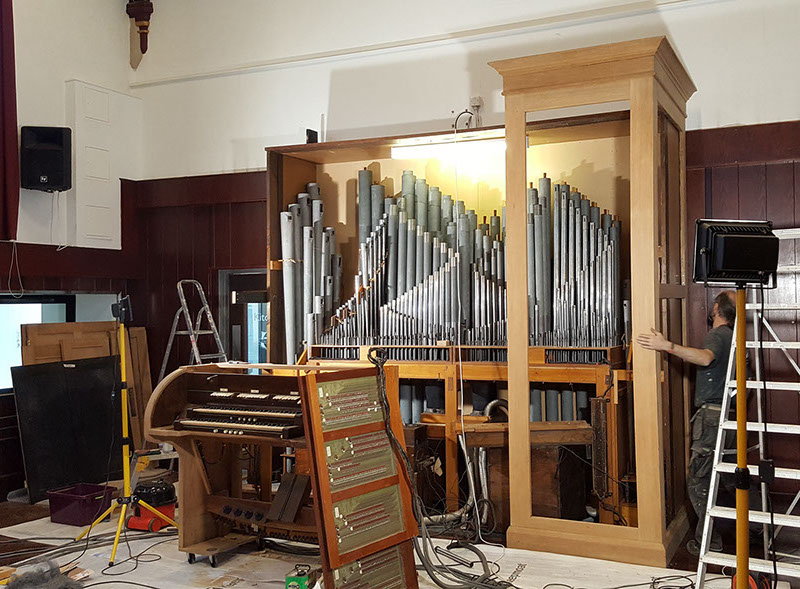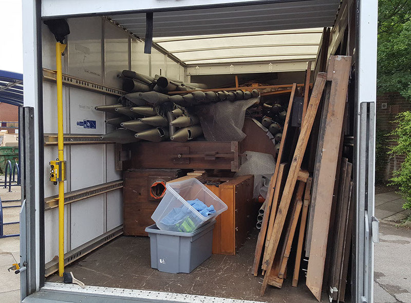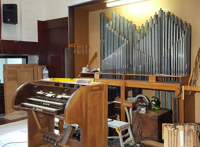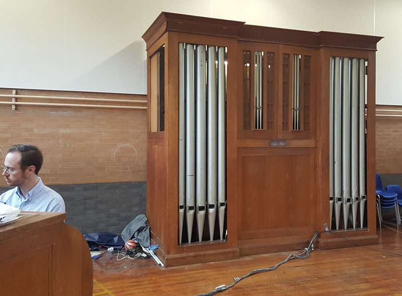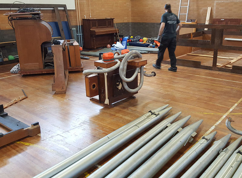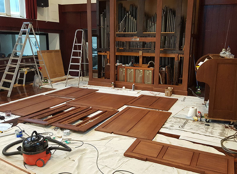 This project involved the removal of a lovely 4-rank Compton organ from a school in Woking, transporting it to a school in Ealing, reassembling it and undertaking repairs as required, refinishing of all woodwork (including staining it down as required by the client), making a new back board (the original having been lost years ago), respraying the case pipes gold instead of silver, restoration work to the console and pedals, rewiring the mains electrical installation, testing and tuning - all by the end of the school holidays in time for term starting!