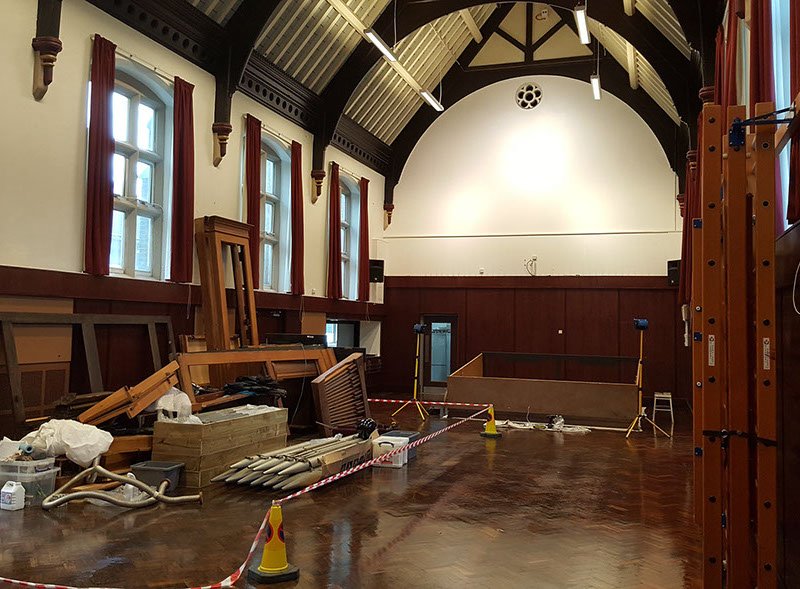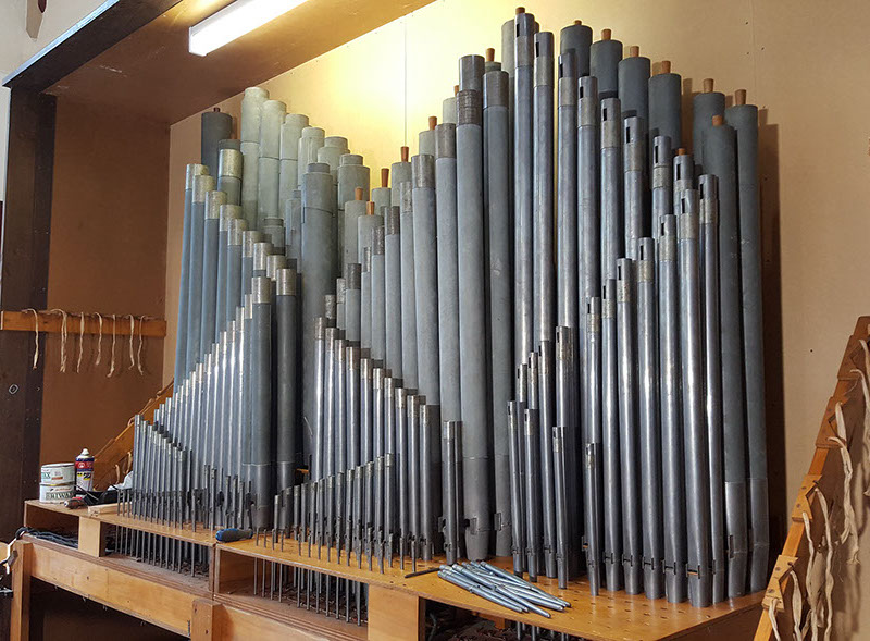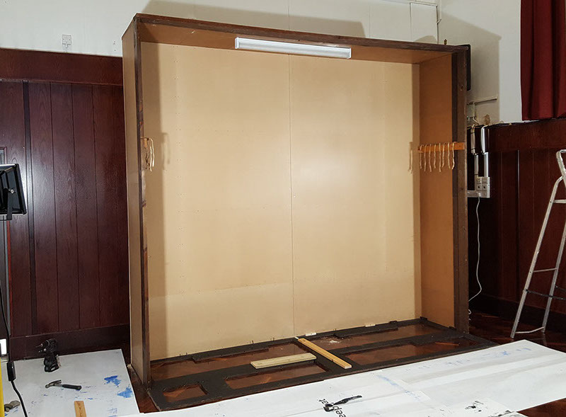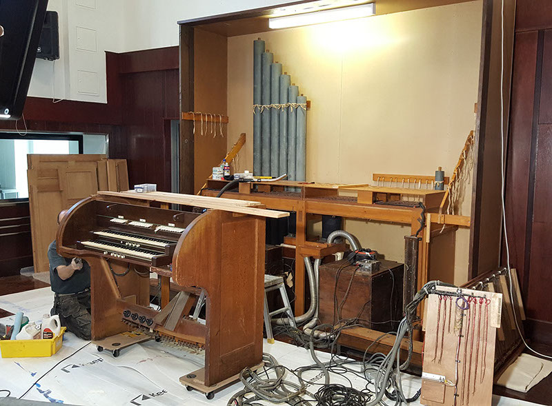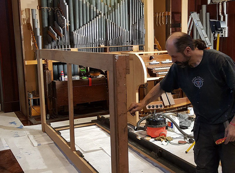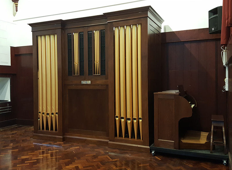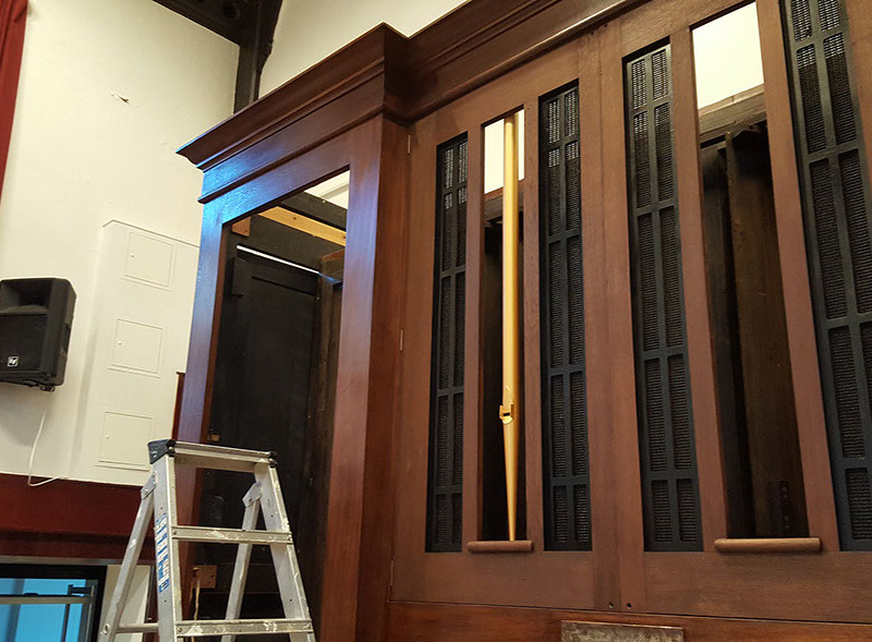 This project involved the removal of a lovely 4-rank Compton organ from a school in Woking, transporting it to a school in Ealing, reassembling it and undertaking repairs as required, refinishing of all woodwork (including staining it down as required by the client), making a new back board (the original having been lost years ago), respraying the case pipes gold instead of silver, restoration work to the console and pedals, rewiring the mains electrical installation, testing and tuning - all by the end of the school holidays in time for term starting!